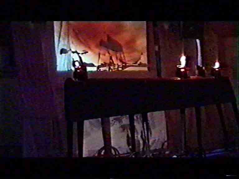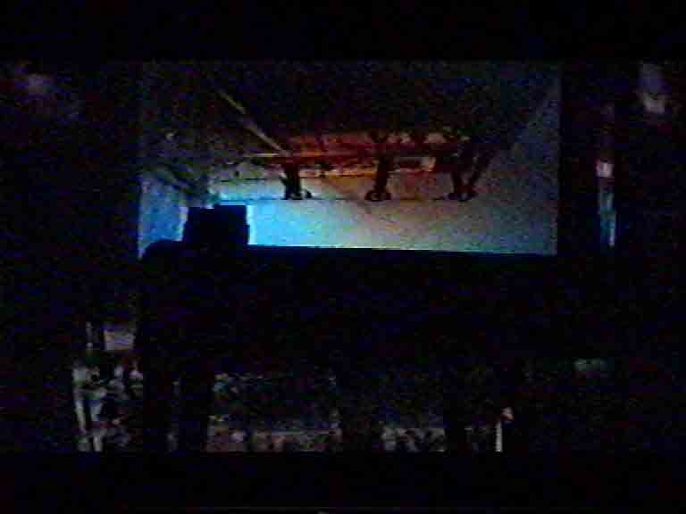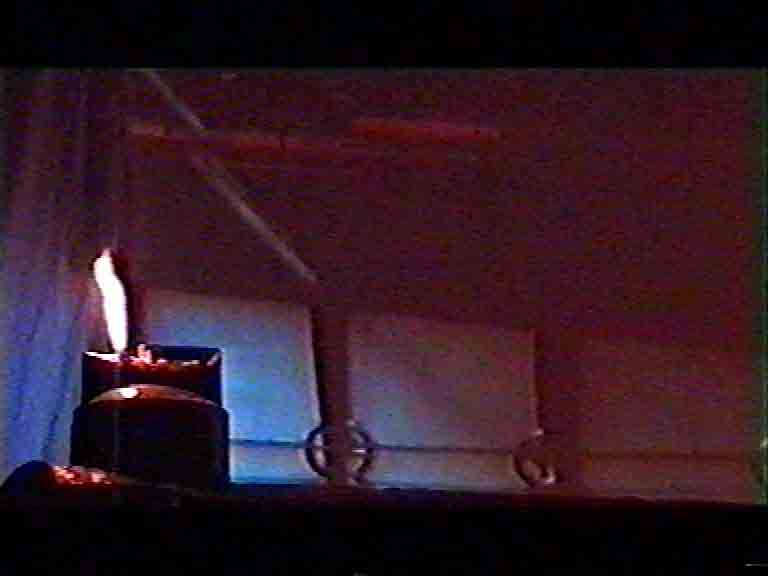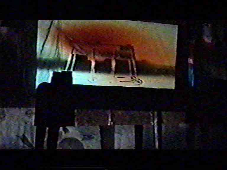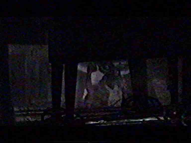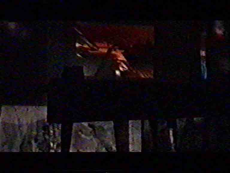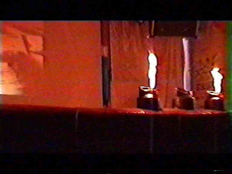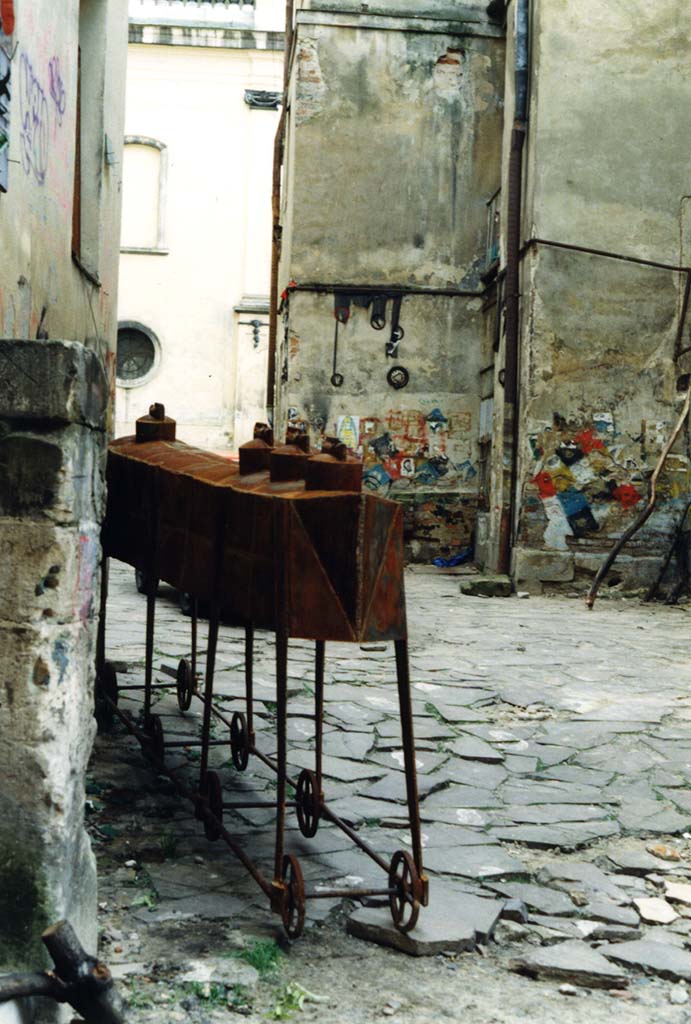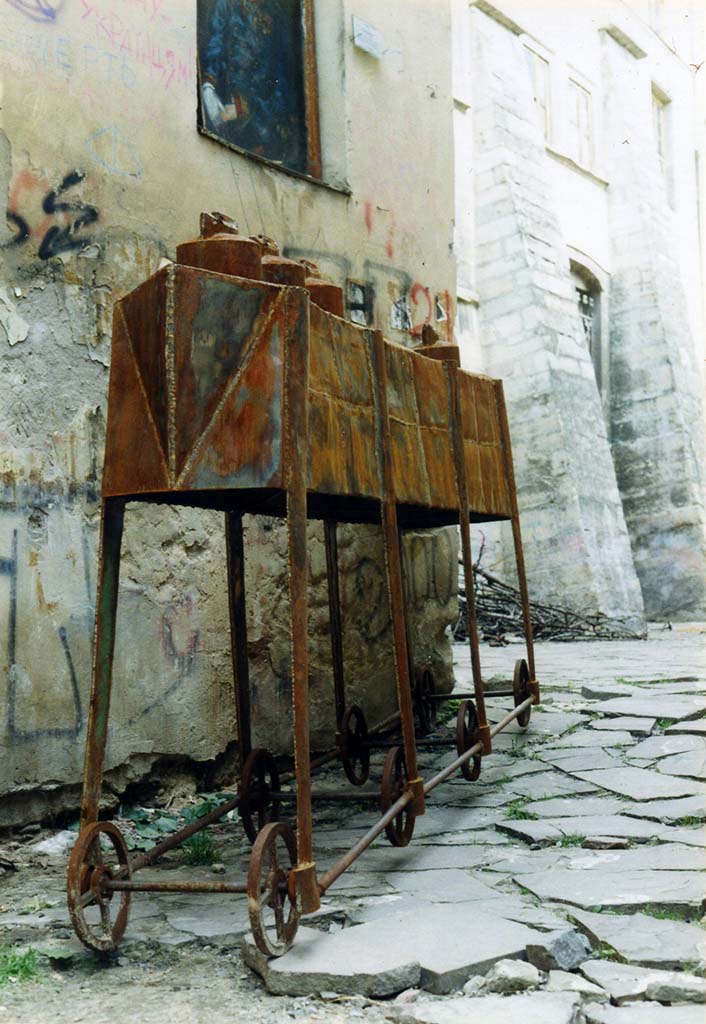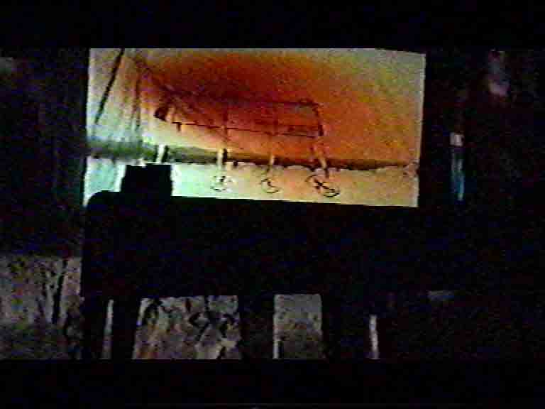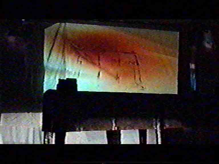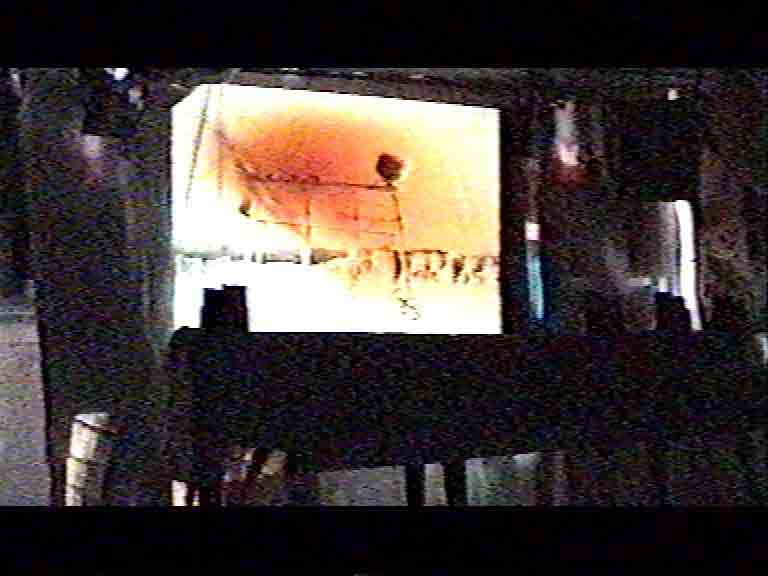 Performance “The Last Myth” with sculpture, fire and video. Night klub “Lyalka” in Lviv, 2000. Participants: Jan Potrohos (sculpture, instalation), Nirvana (3D modeling, animation), Viktor Lavnyi (installation, cutting), Artur Ruschak (sound track), Tanya Smriga (poetry), Taras Benyakch (audio), Ruslan Tremba and Maksym Sobuckyi (assistans).
