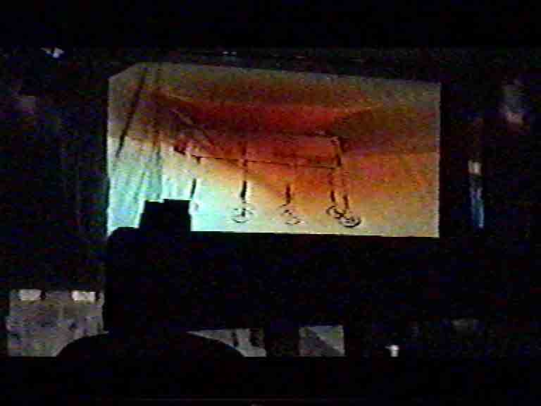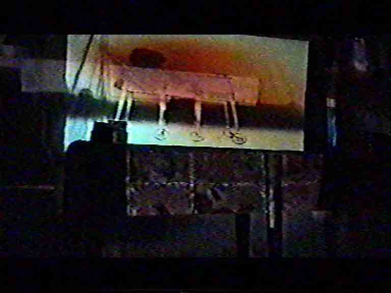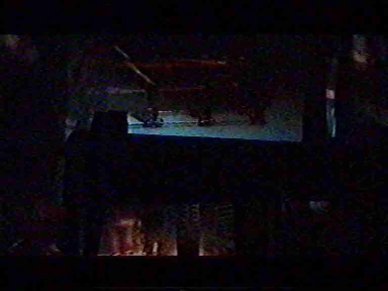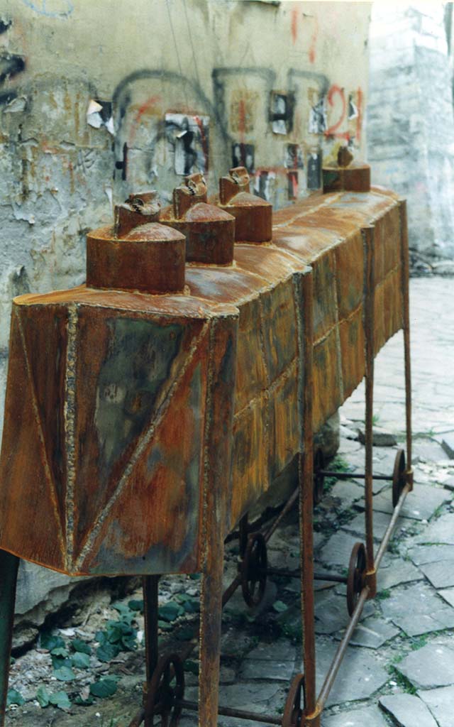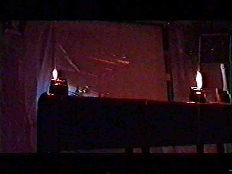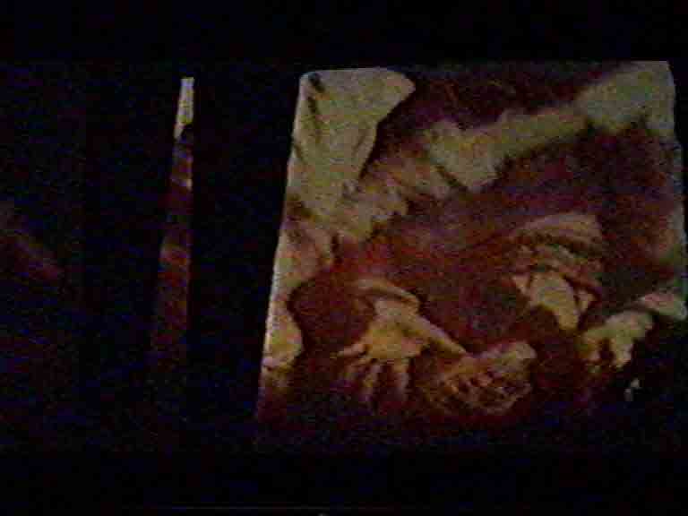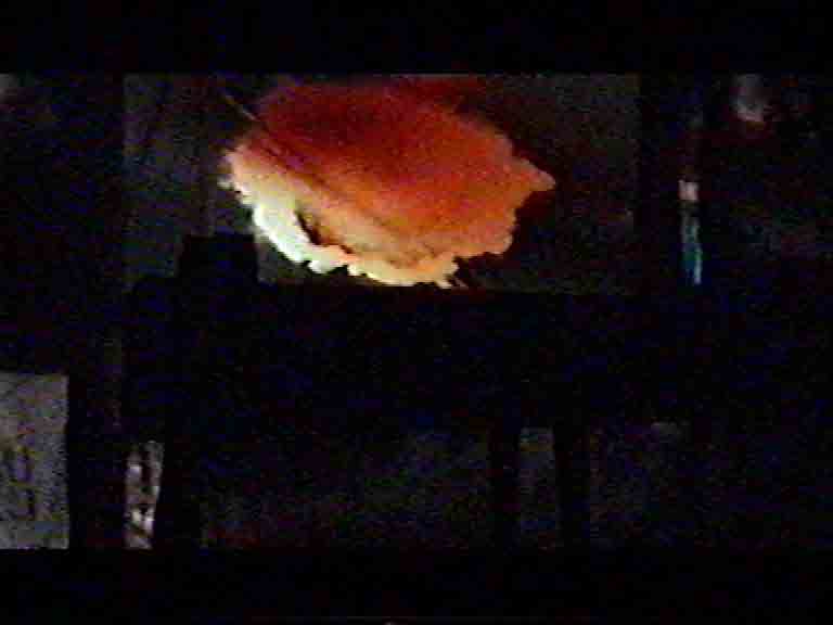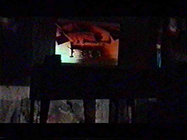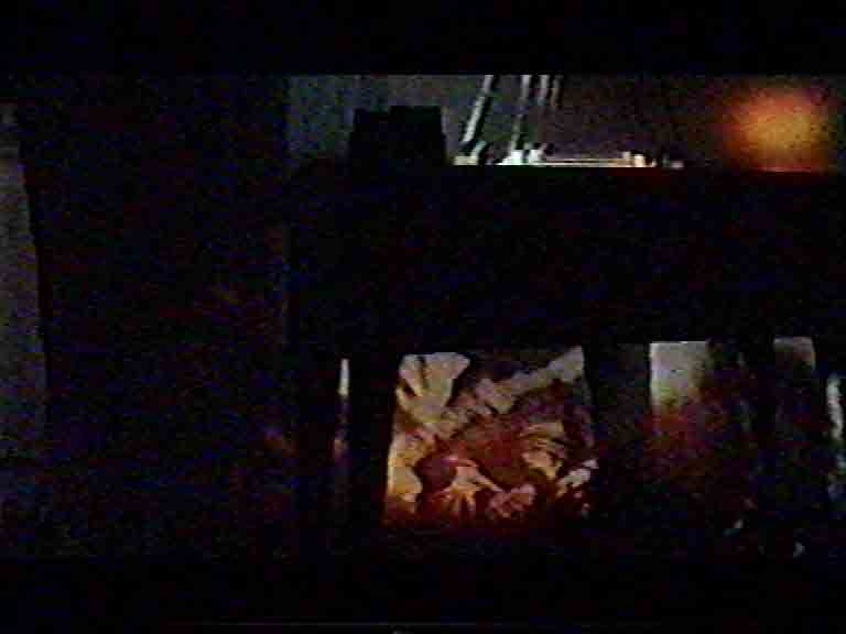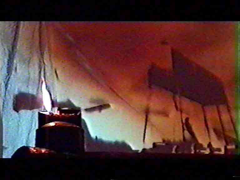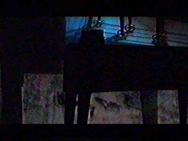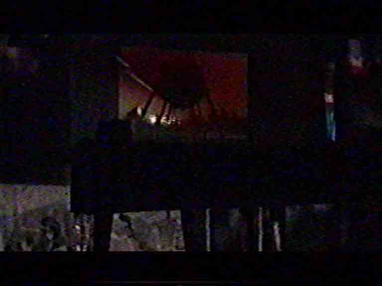 Performance “The Last Myth” with sculpture, fire and video. Night klub “Lyalka” in Lviv, 2000. Participants: Jan Potrohos (sculpture, instalation), Nirvana (3D modeling, animation), Viktor Lavnyi (installation, cutting), Artur Ruschak (sound track), Tanya Smriga (poetry), Taras Benyakch (audio), Ruslan Tremba and Maksym Sobuckyi (assistans).