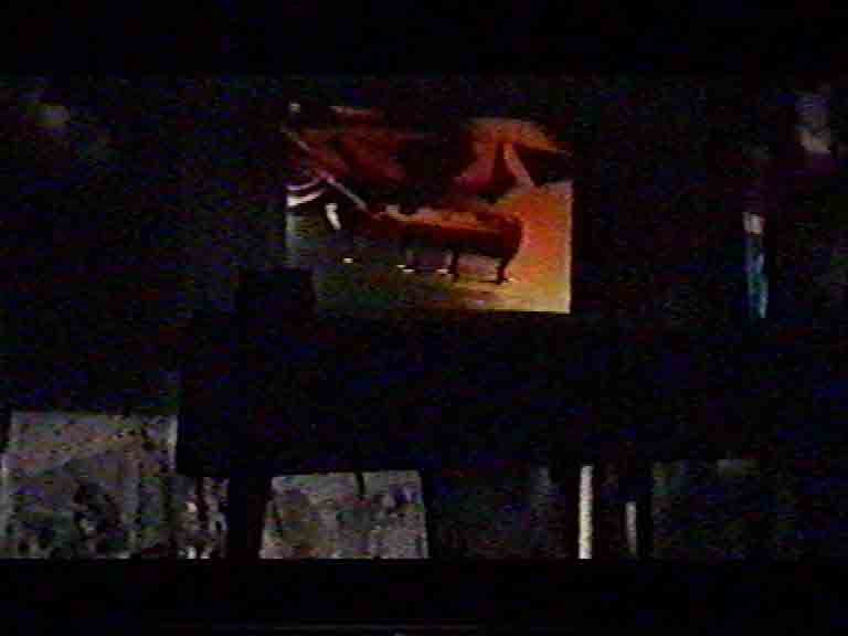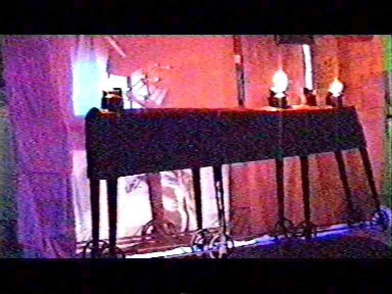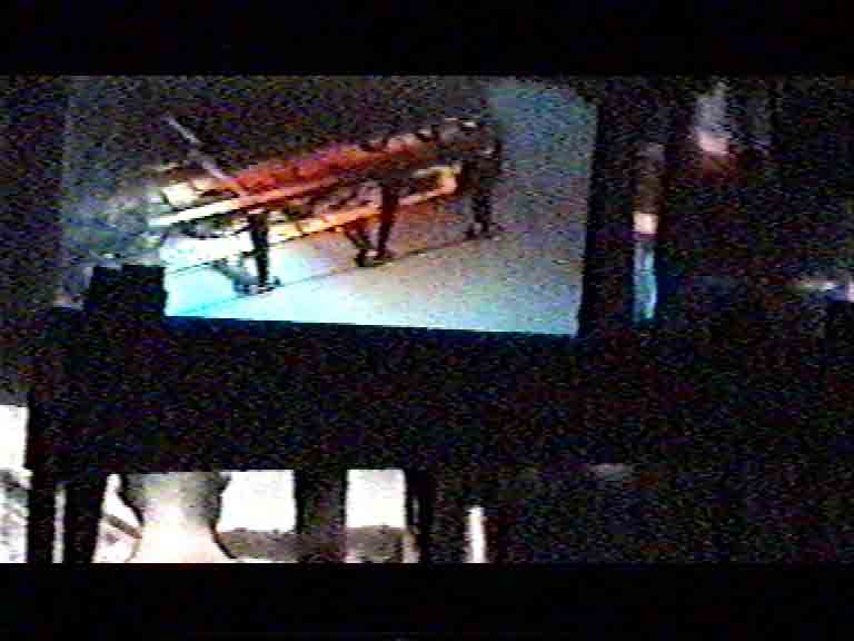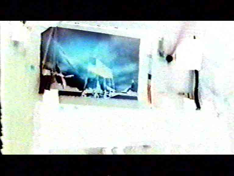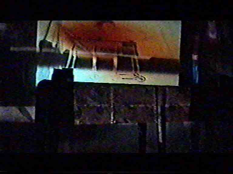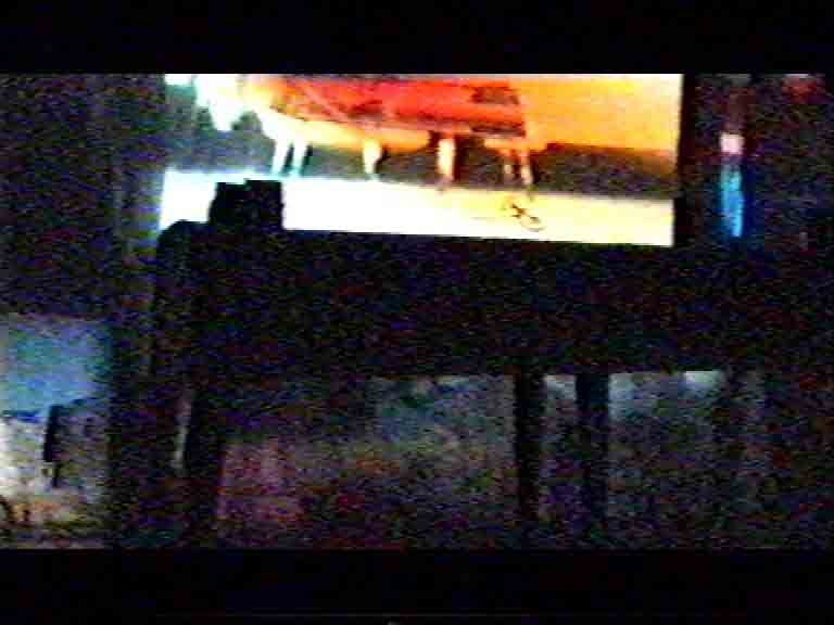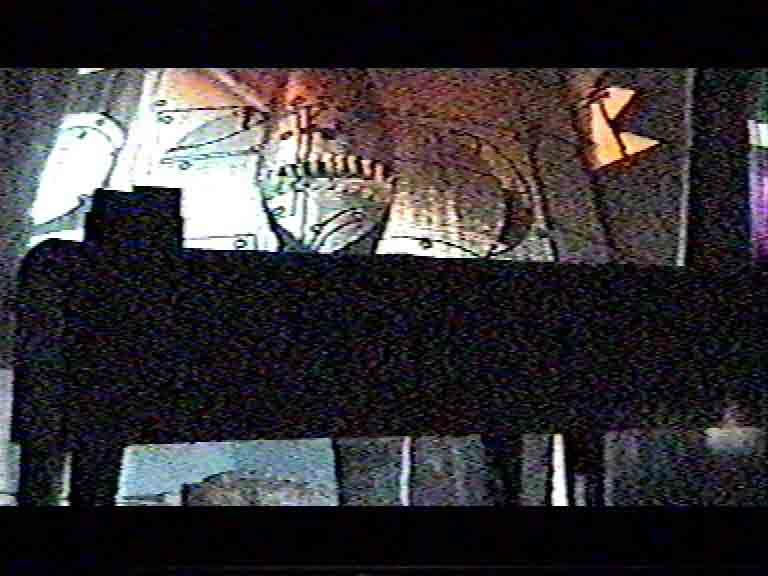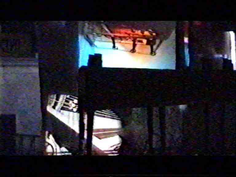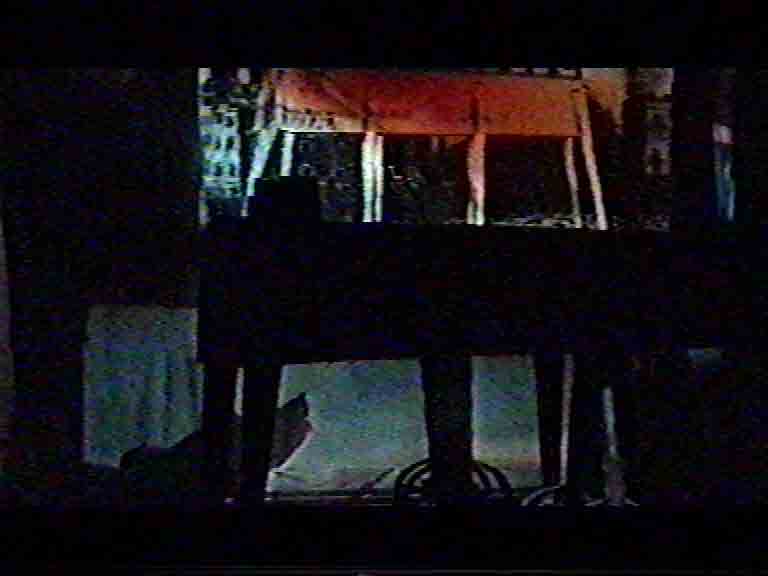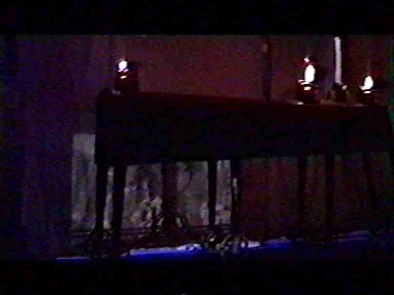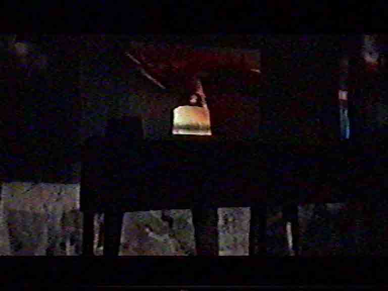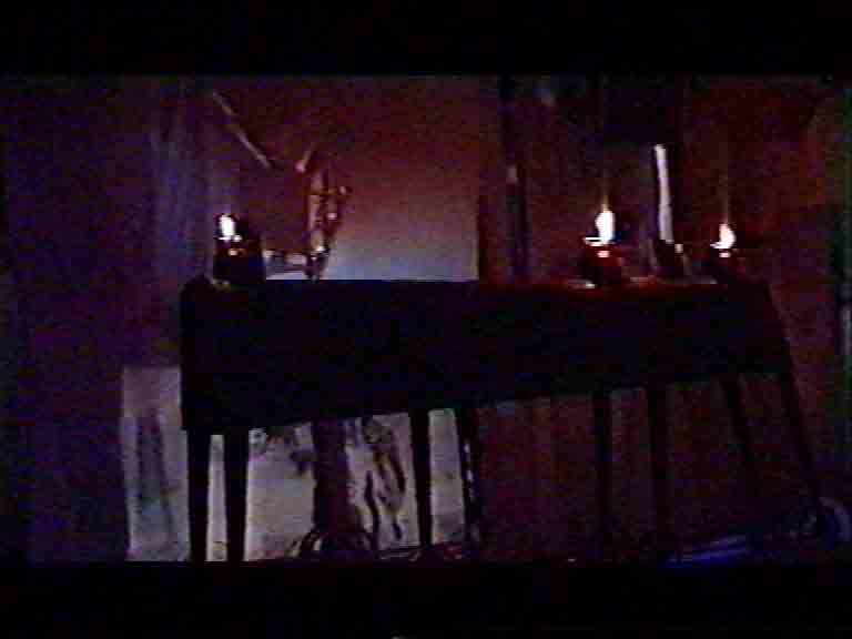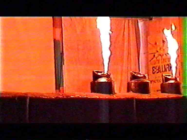 Performance “The Last Myth” with sculpture, fire and video. Night klub “Lyalka” in Lviv, 2000. Participants: Jan Potrohos (sculpture, instalation), Nirvana (3D modeling, animation), Viktor Lavnyi (installation, cutting), Artur Ruschak (sound track), Tanya Smriga (poetry), Taras Benyakch (audio), Ruslan Tremba and Maksym Sobuckyi (assistans).